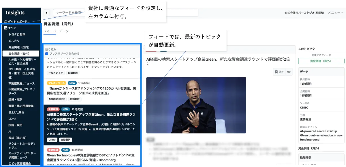 たとえば、特定のキーワードに基づくニュース記事、業界動向、競合他社の発信情報などを一元管理することが可能です。